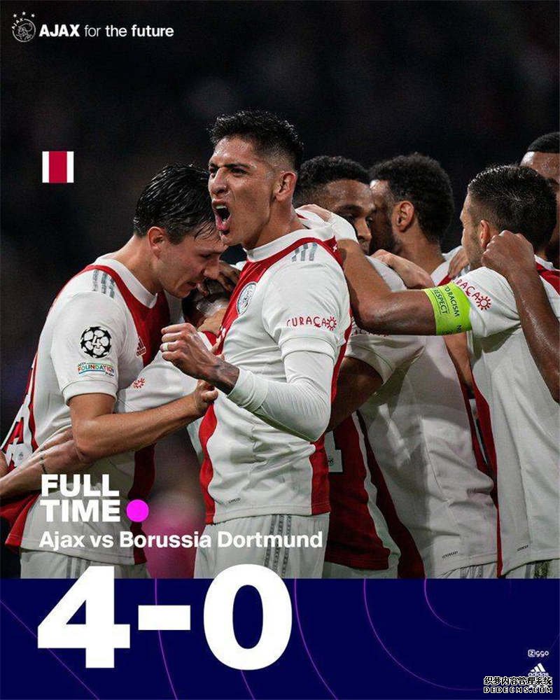 最終全場比賽結束,主隊阿賈克斯以壓制性的比分4-0大勝多特,小組賽前3場全勝,且瘋狂打進11個進球。